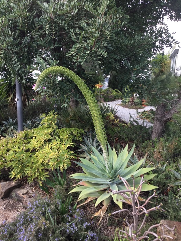 Vanwege de warmte van afgelopen dag schieten de planten de grond uit en staat er van alles in bloei. Aloës, narcissen, Spaanse Margrieten, Brem, Agave, Crassula, orchidee, sinaasappelboom, Amandel, rozemarijn en Citroenboom. Die laatste heeft zelfs al een klein vruchtje.