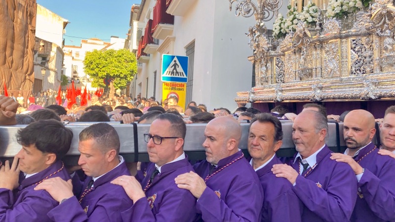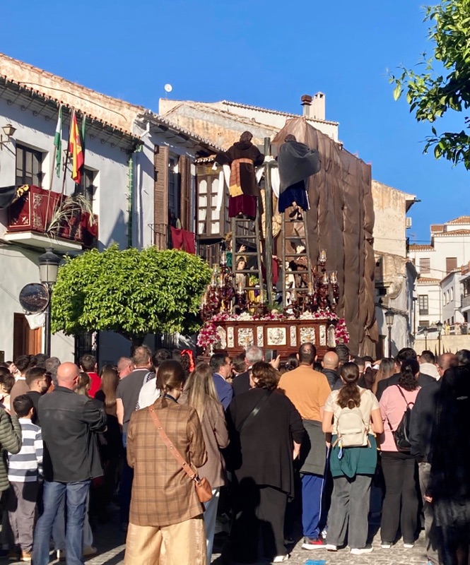 Hier gaat de troon met de gekruisigde Jesus. Een beetje lastig te onderscheiden met het bruine doek dat tegen de gevel van een te restaureren gebouw hangt.