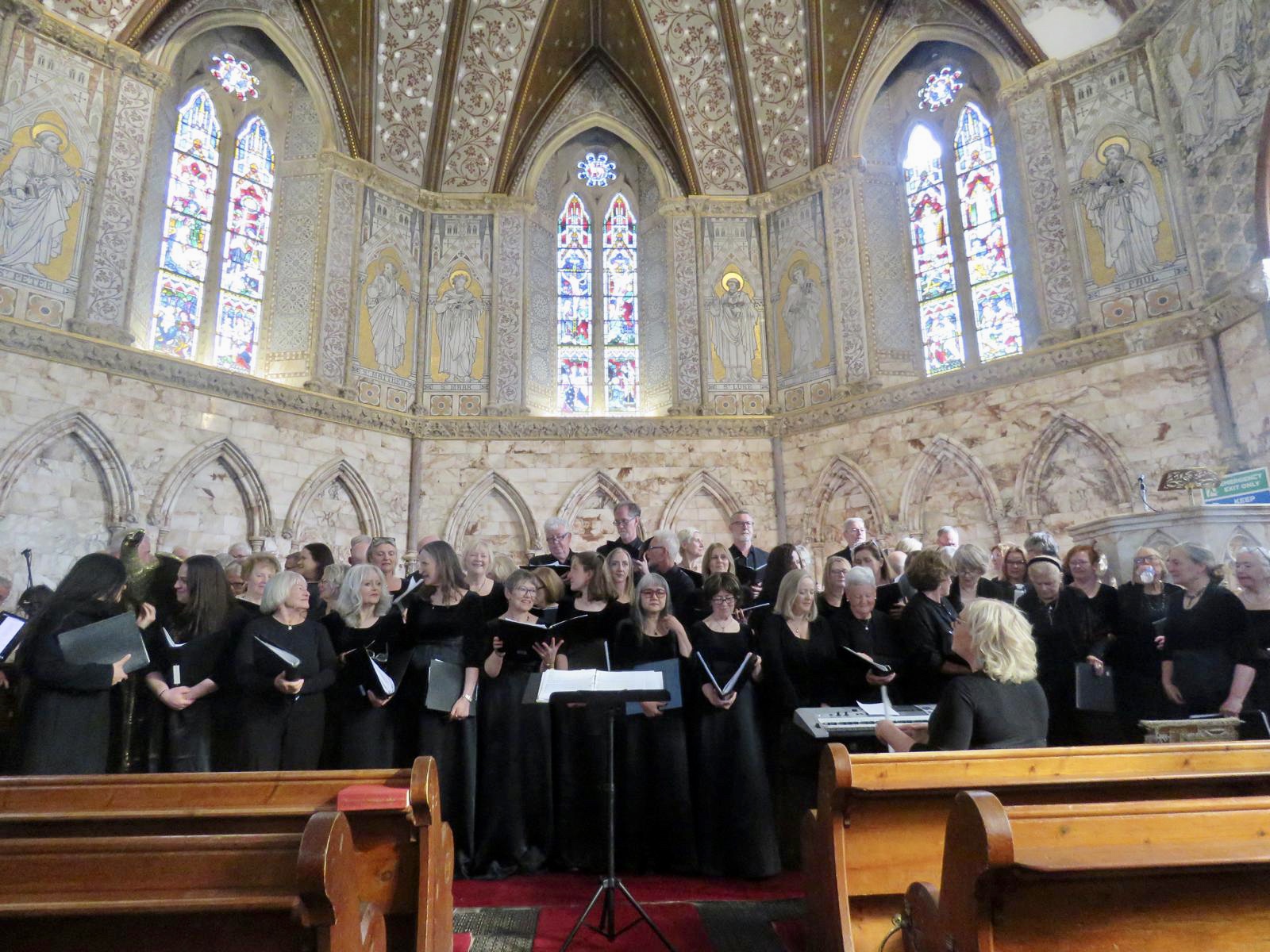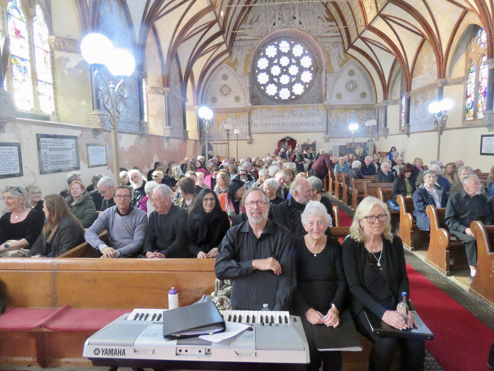 Beide koren zongen vijf liederen en daarna nog twee gezamenlijk. En hoe heerlijk is het om in totaal met 60 zangers samen te zingen. De kerk was bijna te klein voor het geluid dat we produceerden. En het te restaureren gebouw puilde ook nog eens uit van de ongeveer 200 toehoorders.