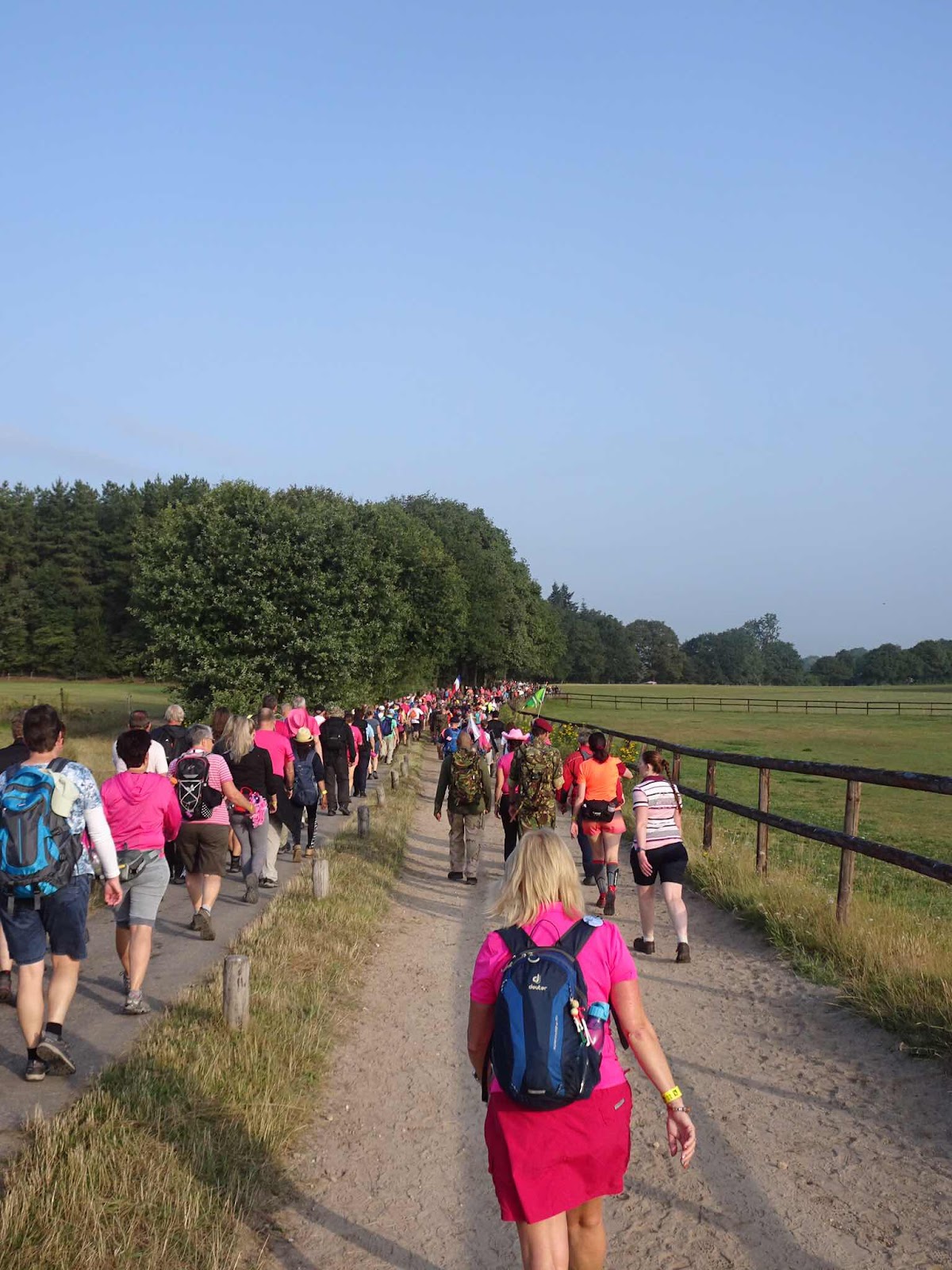 Om 4.30 uur op. We hadden een vroege start en dan mag je om 4.45 starten maar we kwamen pas om 5.18 bij de start aan, dan is er geen wachtrij meer van wandelaars en konden we, na gescanned te zijn, direct doorlopen. Bijkomend voordeel is dat het tussen twee vertrekkende groepen een kwartiertje minder druk is.