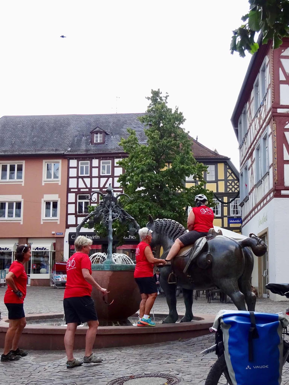 Bij het langs lopen zag ik al dat het brons van het paard op sommige plekken koperkleurig glom. Van het half uur dat we er zaten zijn er wel een stuk of tien kinderen en volwassen op het beest geklommen. Leuk stadje trouwens dat Alzey.