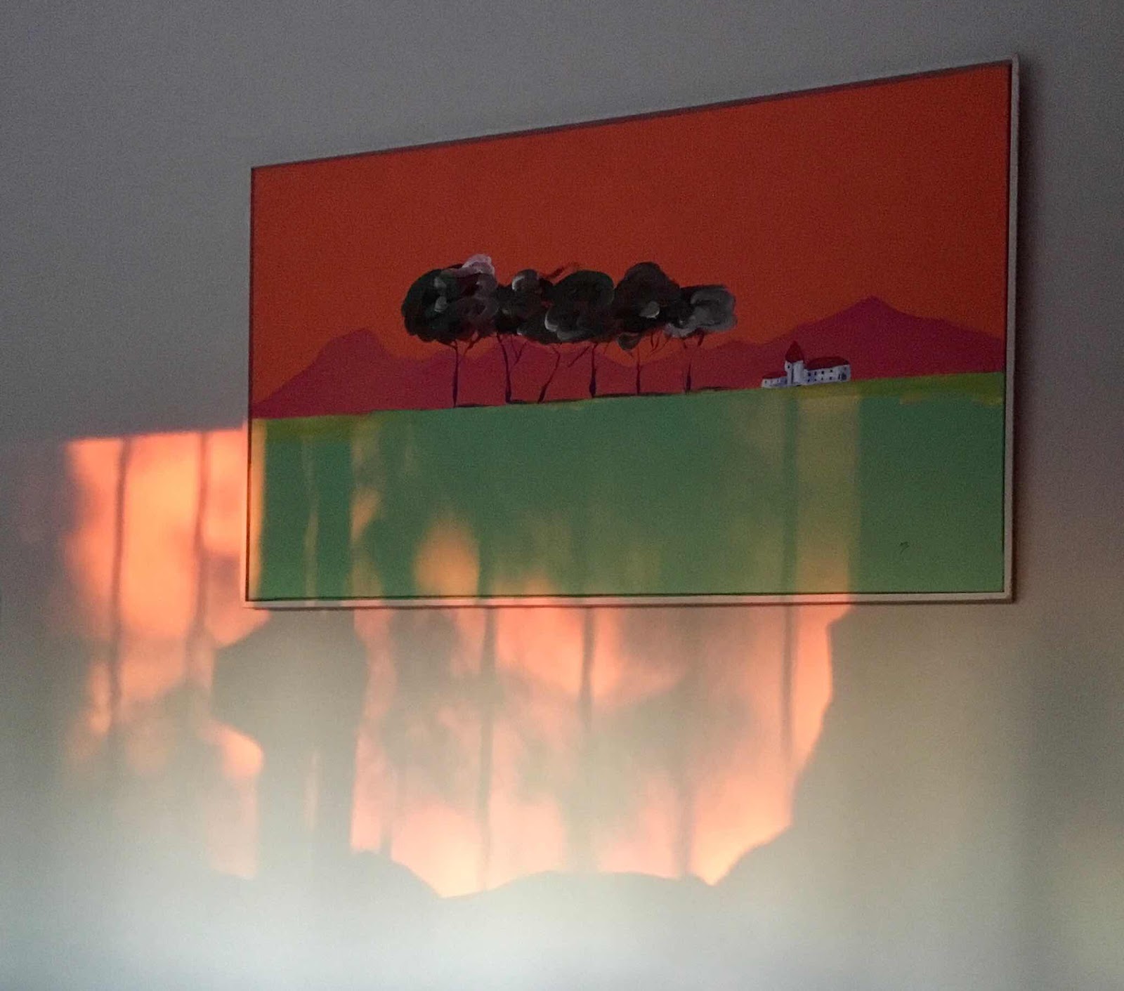 Vanmorgen viel me het lijn- en kleurenspel van de opkomende zon met het schilderij op. Natuurlijk moet ik dan wel eerder dan ik eigenlijk wil, mijn warme nestje uit om een foto te maken. Ik was dus gewoon vroeg op.