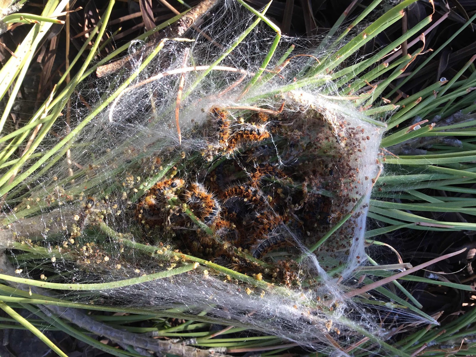 Later controleerde ik de pijnbomen op processierupsnesten. Ik zag er drie maar een zit te hoog dus die zit er nog.