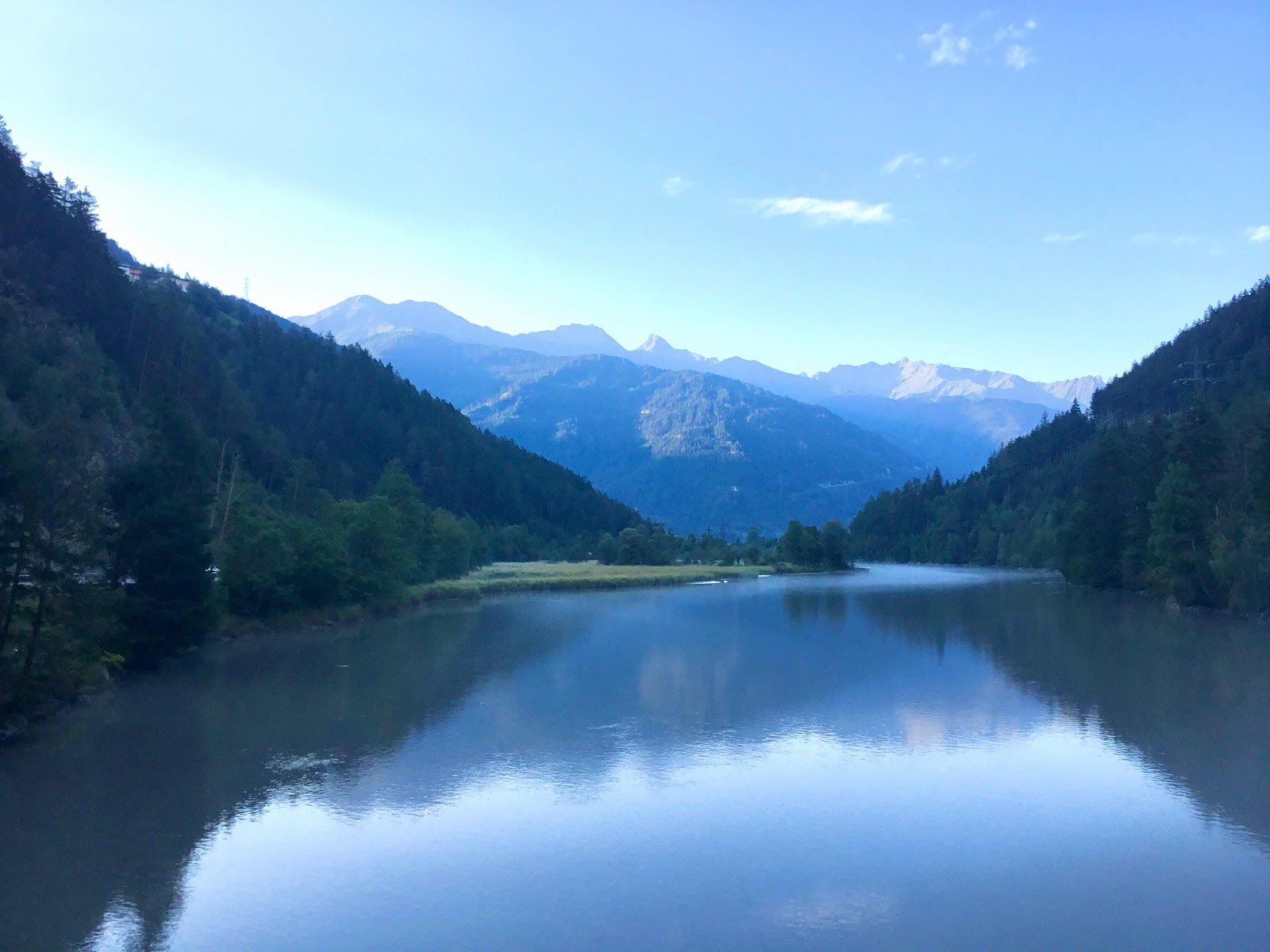 Kwart over zeven kwamen we langs een stuwmeer in de Inn. Met wat mist op het spiegelgladde oppervlak.