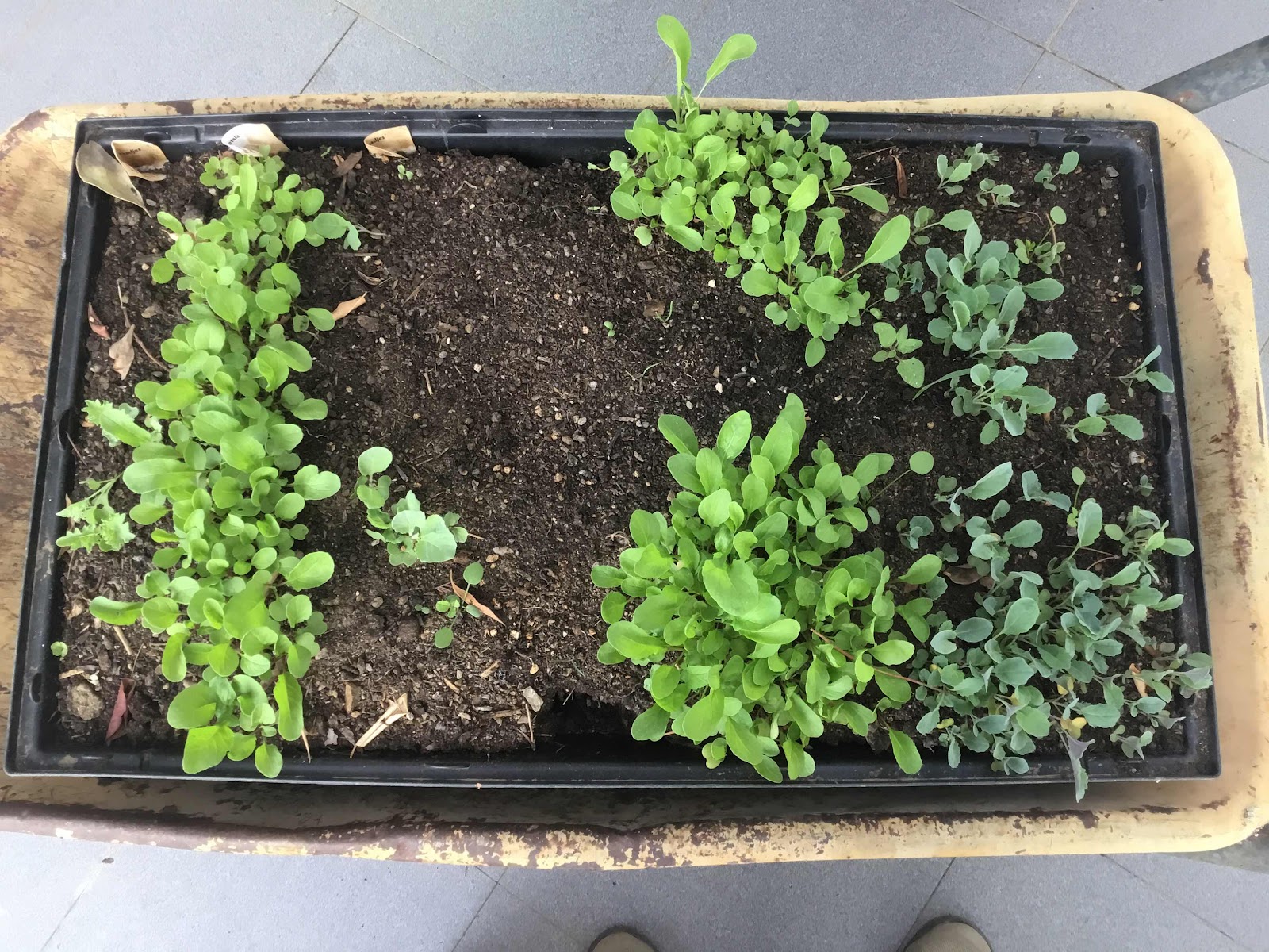 Net nadat we terug waren in De Klompen zaaide ik een aantal soorten in een bak. Rucola, spitskool, boerenkool en palmkool. En veel kwam goed op.
