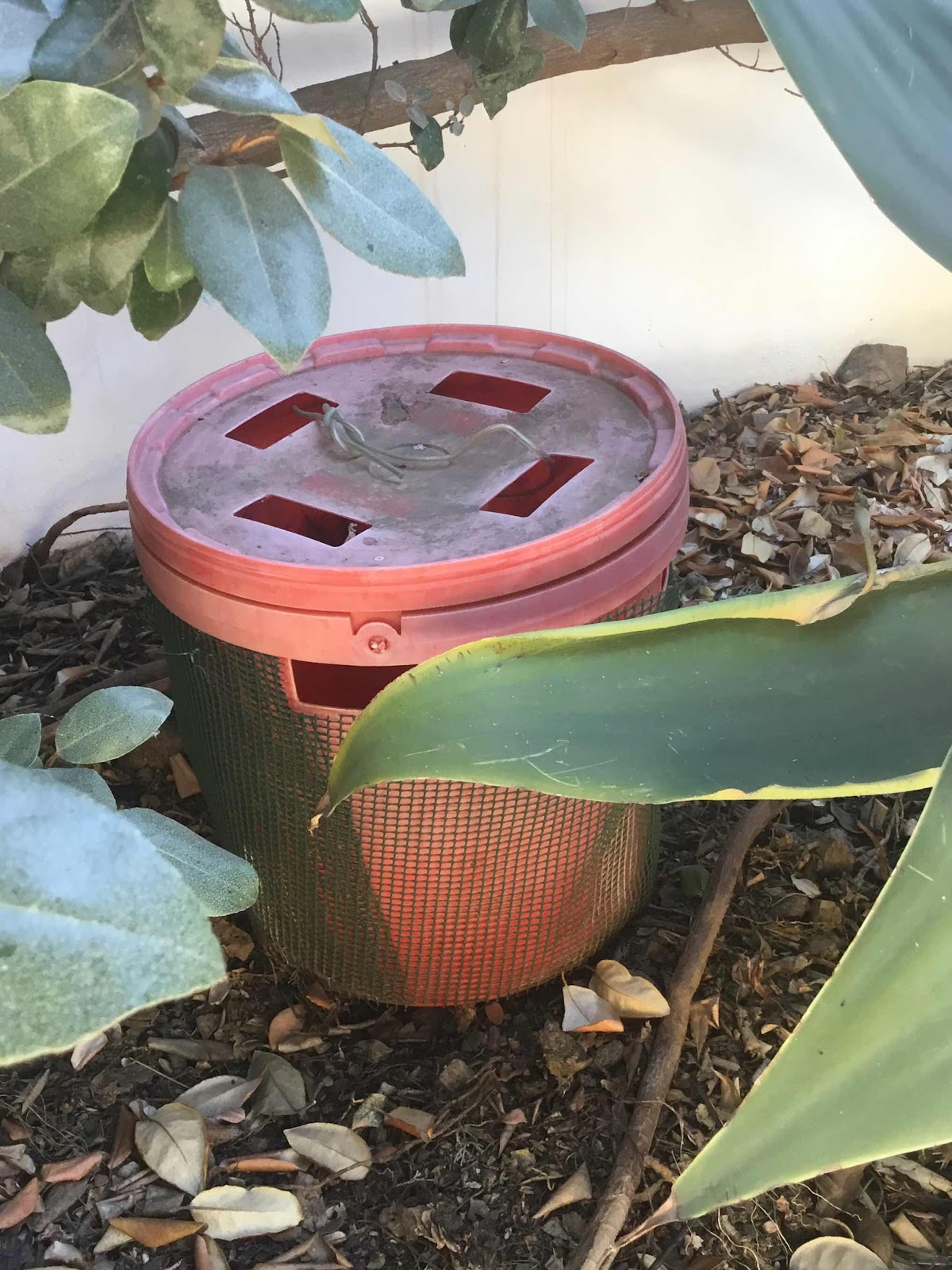 Deze emmer is een val voor de kevers. In de emmer hangt een dingetje met feromonen die de kevers onweerstaanbaar aantrekt. Ik zeg dingetje omdat die feromonen elke keer anders verpakt zijn.