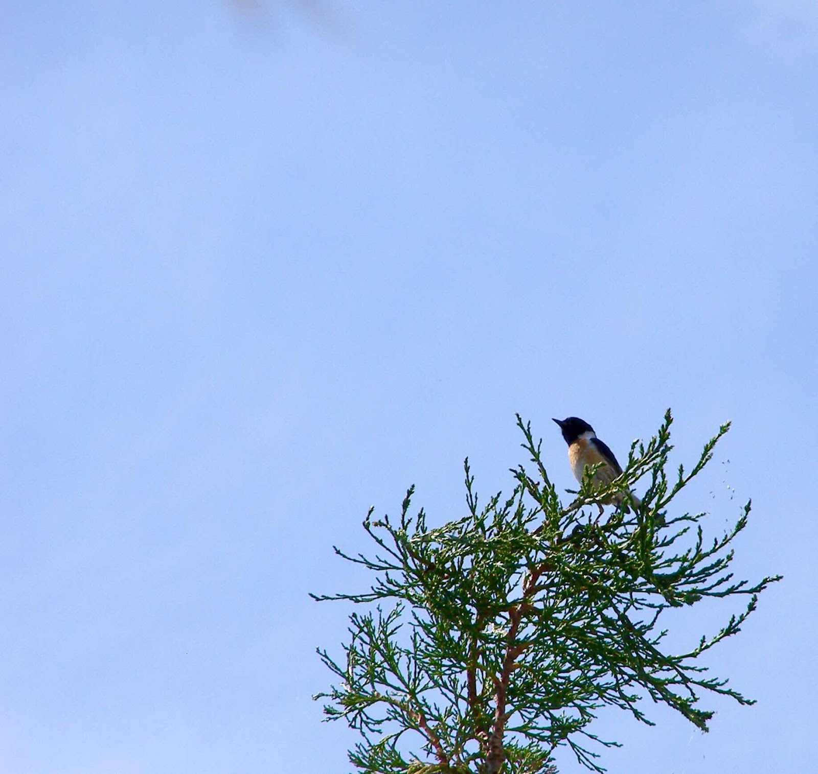 En gelukkig was het vanmorgen vroeg windstil dus zat de Roodborsttapuit weer op zijn favoriete plek hoog in de cipres.
