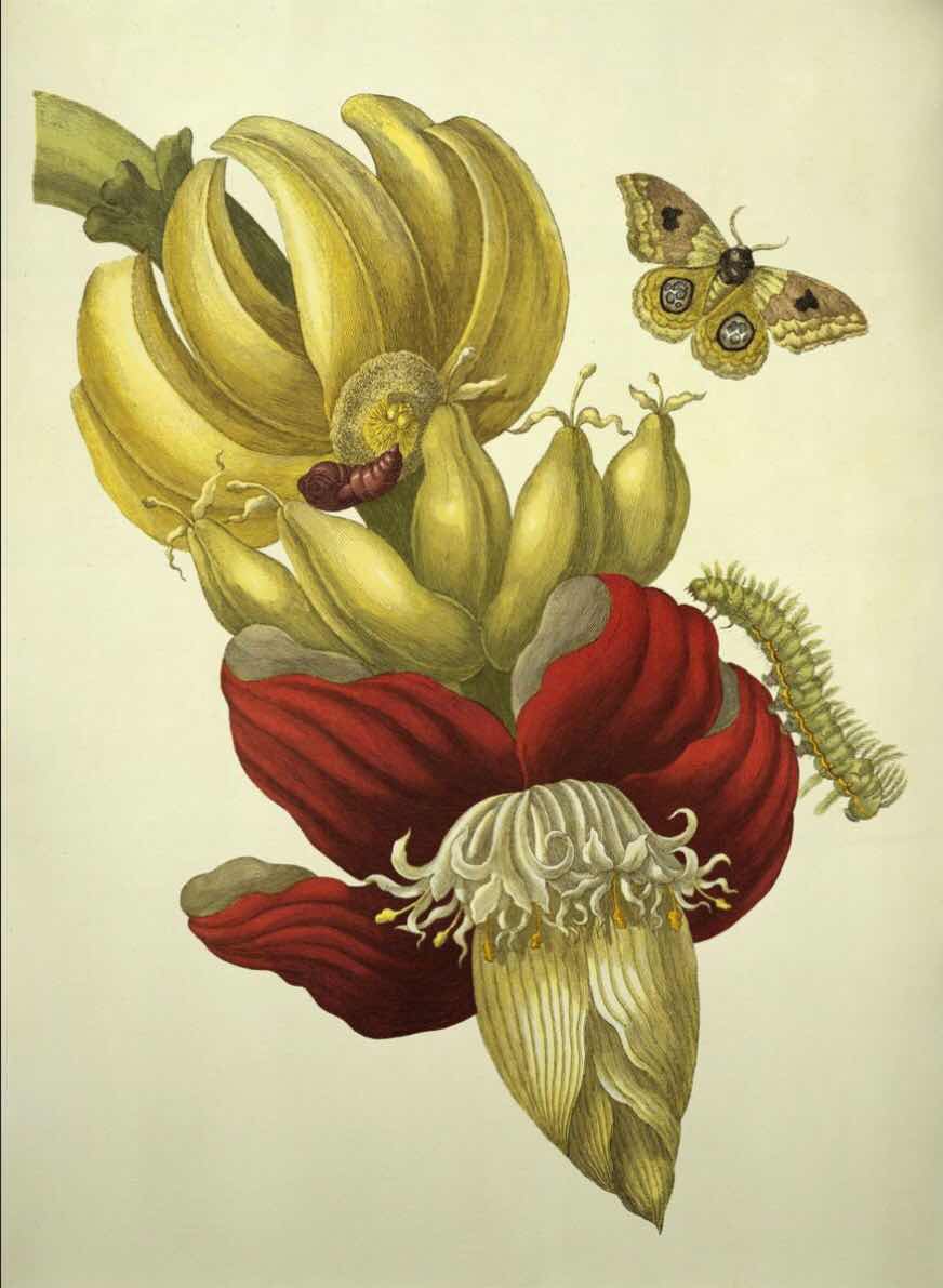 Maria Sibylla Merian, Duitse kunstenares en entomologe. 1647-1717. Zij maakte tijdens haar leven de meest prachtige kunstwerken. Maar niet alleen dat. Naarmate ze meer en meer studie maakte van de planten ontdekte ze ook dat bepaalde insecten en dan vooral vlinders in alle stadia, afhankelijk waren van die planten. Sindsdien schilderde ze de, in die tijd verachte schepselen, tot in de fijnste details.