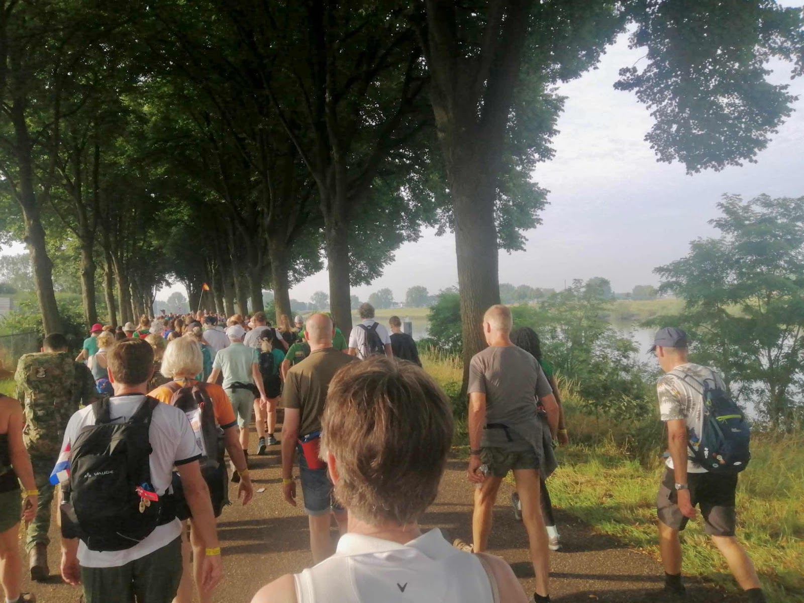 Geweldig gelopen en we waren om half drie bij het eindpunt waar we te horen kregen dat morgen vanwege de verwachte hitte alle afstanden met tien kilometer worden ingekort. En dat vind ik echt jammer want voor mij is het absolute hoogtepunt van de Nijmeegse het via de pontonbrug oversteken van de Maas en daar komen we nu dus niet langs.