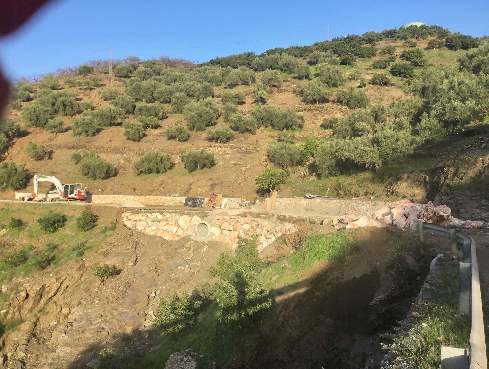 Eigenlijk was de weg vorige week donderdag al gerepareerd alleen de vangrail ontbrak nog dus bleef alles potdicht.