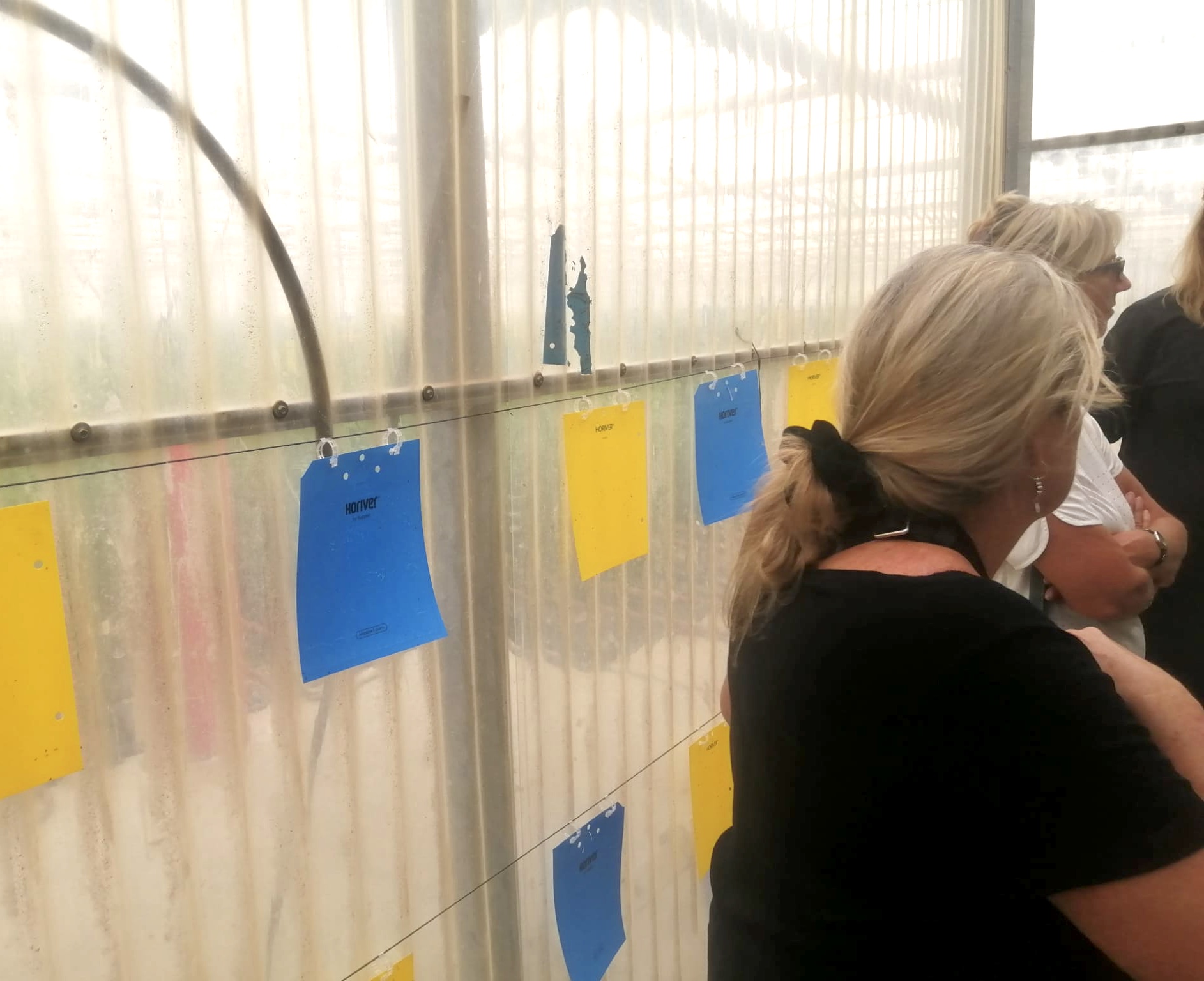Voordat we een kas ingingen moesten we door een sluis. De geel en blauwe kaarten zijn plakkerig en trekken insecten aan. Deze kleuren zijn het meest aantrekkelijk voor het kleine gespuis.
