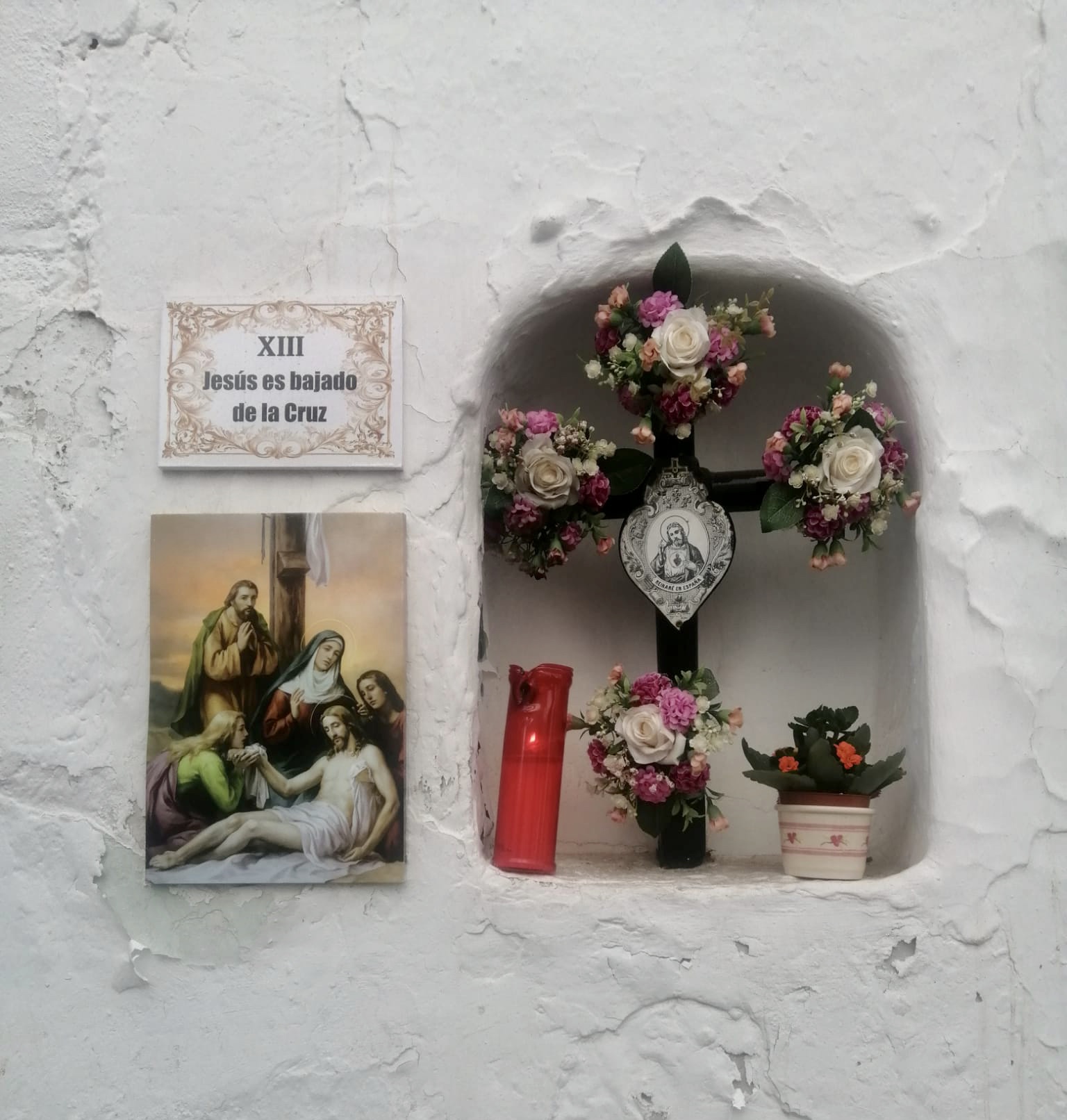 Hoe vaak ben ik al niet langs dit nisje gelopen? Duizend keer? In ieder geval staan er altijd bloemetjes en een kaarsje.