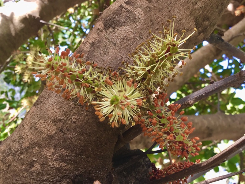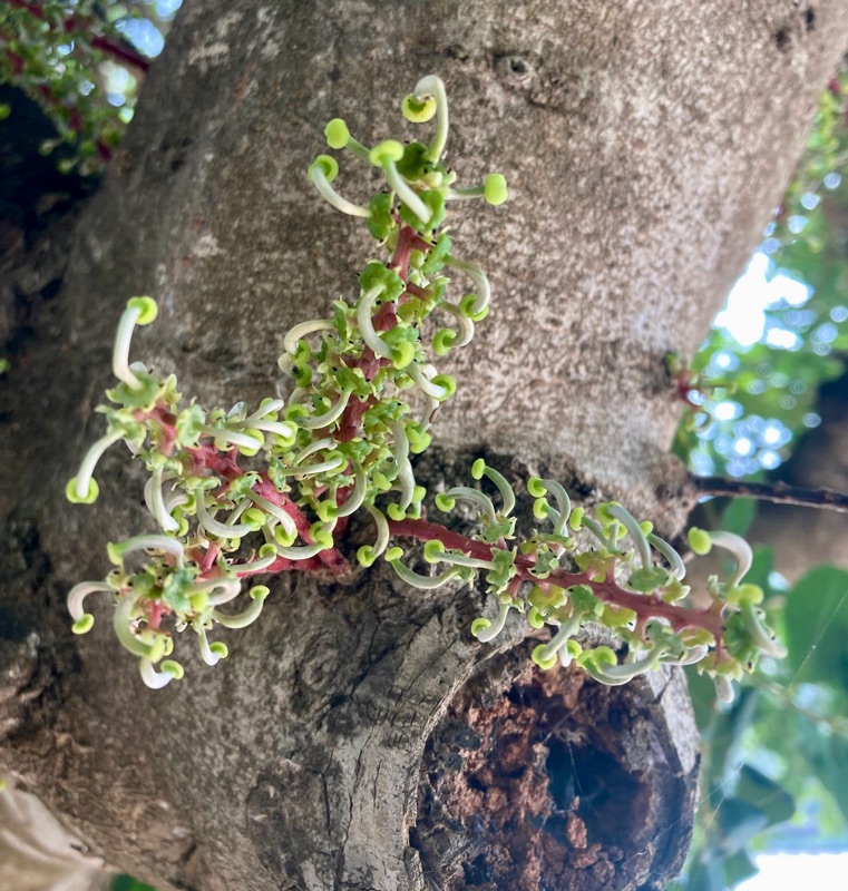 Bij de cateraarster stond een Johannesbroodboom. En wat ons opviel is dat deze boom die nu in bloem staat een behoorlijk weeïge geur afgaf. Mij is altijd verteld dat het alleen de mannelijke boom is die zo wee ruikt maar dat is dus niet zo. De geur van de vrouwelijke boom is wel wat minder sterk.