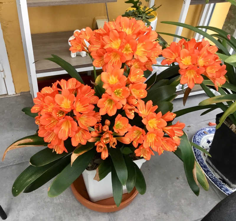 Clivia, niet de zuster maar de plant bloeit. En hoe. Acht bloemstelen zitten er in. In mijn herinnering nog nooit vertoond. Maar wat een overdaad en dan dat prachtige oranje.