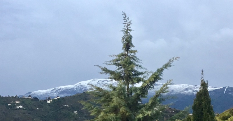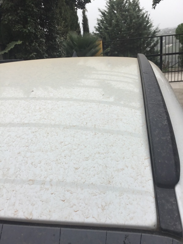 Met een auto die er uitziet als een gevlekte hyena wil je eigenlijk niet gezien worden maar we gingen woensdag toch gewoon ‘op restaurant’ in Torre del Mar voor patat en saté. Onderweg begon het stevig te regenen. Daarmee werd niet alleen de lucht weer lekker helder maar ook de auto schoon. 14 Milimeter viel er. Heerlijk want een maand na de overvloedige regen begon de bovenkant van de tuin alweer droog te worden.
