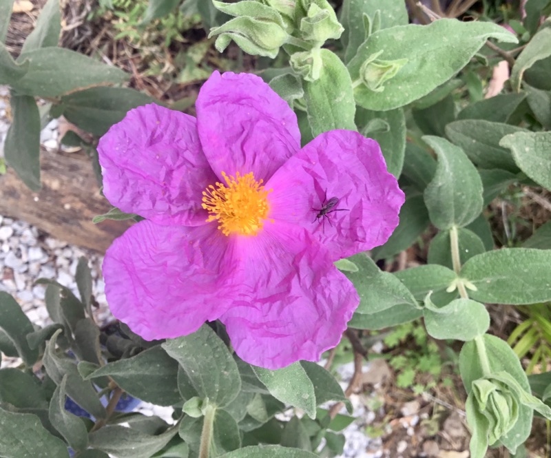 De eerste bloemetjes van de Rockrose. Met als bonus een insect. De bloemen vertederen me altijd omdat ze er zo kwetsbaar uitzien met die kreukeltjes in de baadjes. Ik zou ze, met alle tederheid die in me is, willen gladstrijken.