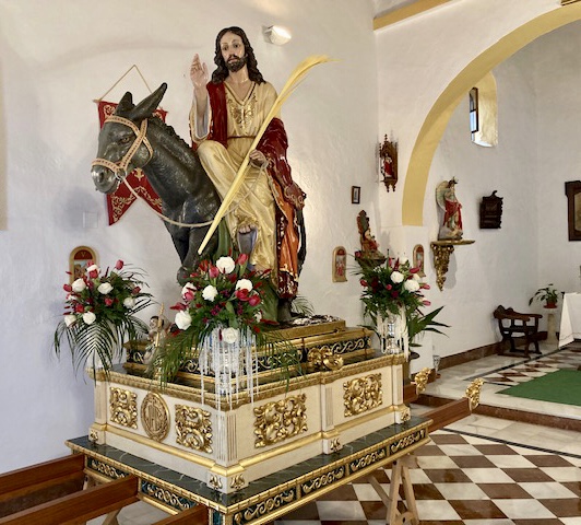 En in de kapel van de heilige Antonio stond Jesus met ezeltje al helemaal klaar op de trono om zondag in processie door het dorp te gaan.