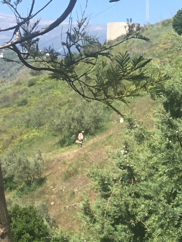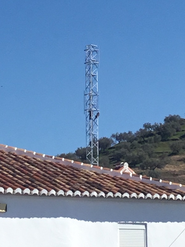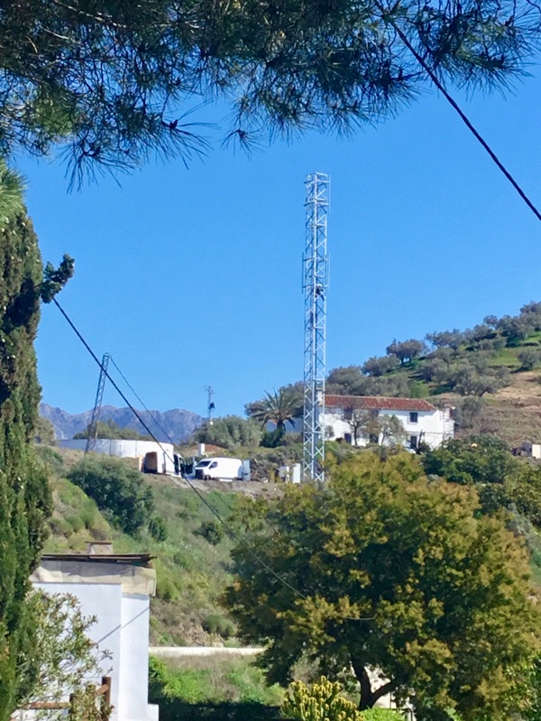 Reden we gisterochtend naar het dorp zagen we ineens dat er een gigantische mast op ‘onze’ berg was verschenen. Natuurlijk hadden we al wel gezien dat er met een graafmachine een plateau uit de berg was gehapt. Vast voor een illegaal huis, dachten we, want er mag nog steeds officieel niets gebouwd worden in ‘de Campo’